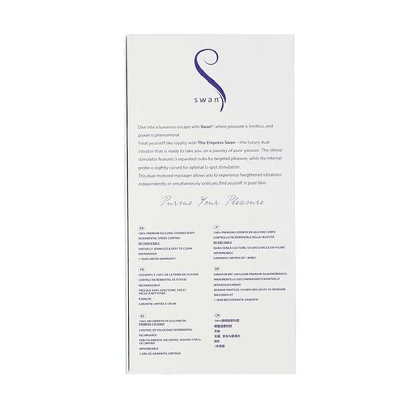 Royalty has made its triumphant return into the Swan line with the Empress Swan in a beautiful new purple hue! Make way for phenomenal power and limitless pleasure all encompassed in a seamless, 100 percent premium silicone covered body.