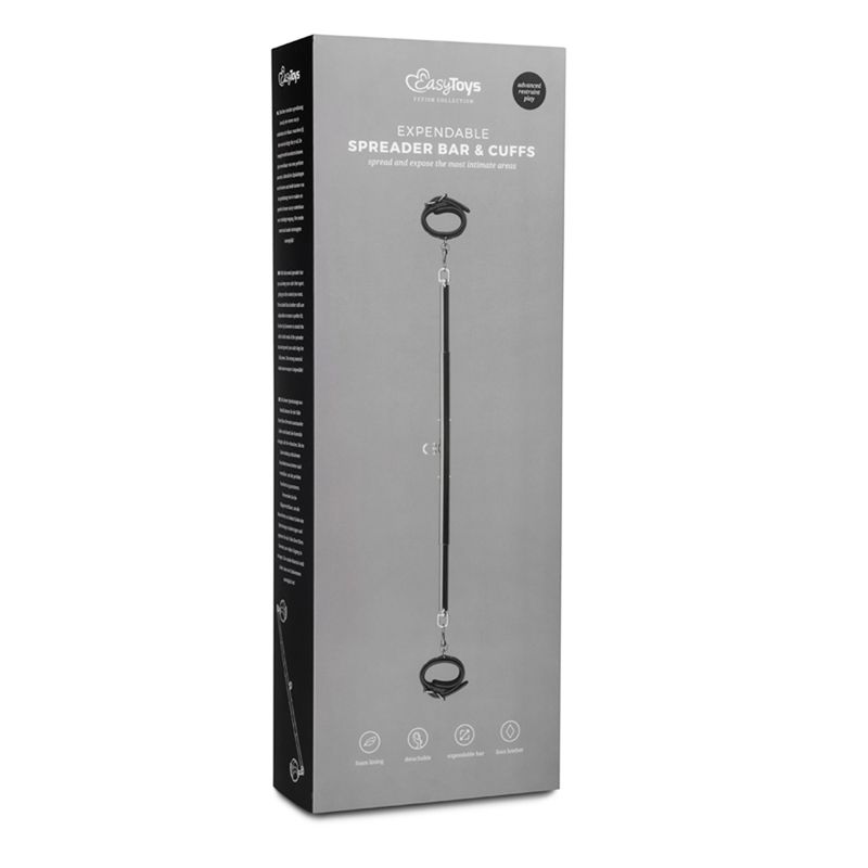 Limit your sub's movements with this strong metal spreader bar with handcuffs. The bar can be mounted on your ceiling using the D-ring on top of the bar. The bar itself can be adjusted in length from 70 cm to 90 cm. The cuffs can also easily be adjusted for a perfect fit. The cuffs are attached to the bar with clip fasteners, so you can detach them and use the cuffs separately. You can also use the ring on both ends to attach other bondage toys, such as ankle cuffs, to the spreader bar.