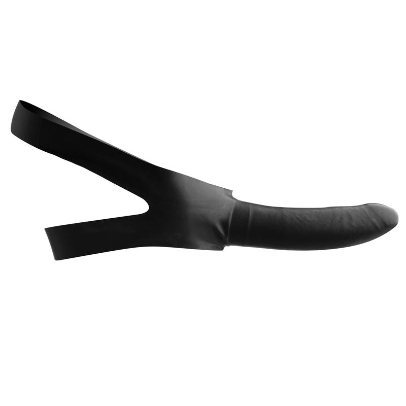 Get up close and personal with the Face Fuk from the Master Series. This stretchy, all-latex strap on is designed to fit over the mouth or chin. You or your plaything can use it as a gag, or wear it on the chin which leaves the tongue free to roam as the dildo penetrates. The rigid black dildo is nice and stiff, with just enough give to the lifelike shaft. Comfortable and sturdy, the stretchy rubber straps run behind the head and beck, keeping it in place and stretching to fit most any size and shape.
