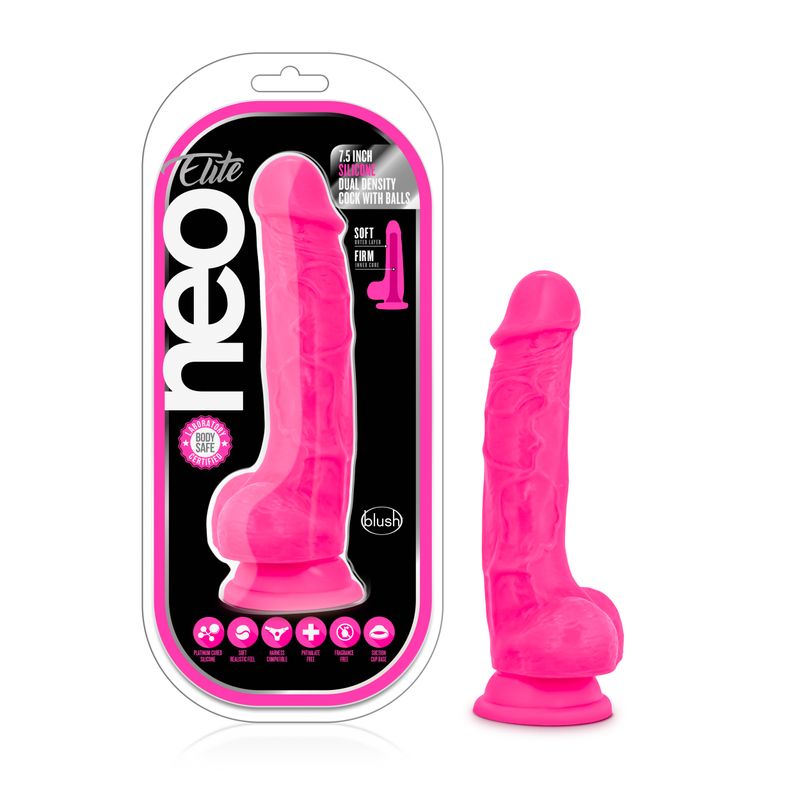 Neo Elite 7.5in Silicone Dual Density Cock with Balls Neon Pink