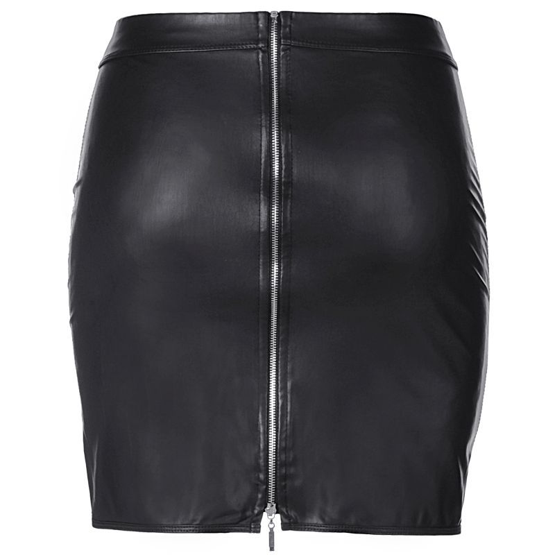 Stylish and seductive stretch wetlook skirt with mesh and criss cross highlights on both sides. A full-length fastening zipper at the rear.